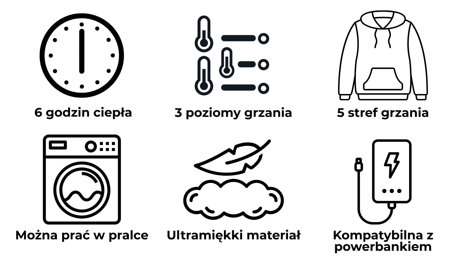 HeatHoody to przytulna bluza z wbudowanymi elementami grzejącymi. Zapewnia natychmiastowe ciepło i komfort, idealna do noszenia w domu lub w podróży. Funkcja ogrzewania działa dzięki doładowywanej baterii, dzięki czemu pozostajesz w cieple, gdziekolwiek jesteś.